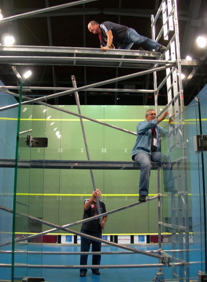 « Avec Yves, on s’est rencontrés dans les années 90, il était président de la Ligue Poitou-Charentes et moi de l’Occitanie. On a tout de suite sympathisés et on avait une grande complicité, on aimait bien raconter des conneries tous les deux (rires). Mais attention, c’était aussi et surtout un énorme travailleur, qui s’est investi sans compter pour le squash. Il était notamment très fort sur le plan administratif, et dans les relations avec les collectivités. Il y a des joueurs issus de sa région qui sont devenus professionnels, en premier lieu Baptiste Masotti, et on les entend souvent remercier Yves pour l’aide qu’il leur a apportés. On se croisait souvent sur les championnats de France jeunes, et on pouvait tout de suite voir que la ligue était très structurée, ils se déplaçaient en bus, avaient tous les mêmes tenues etc. On a également participé à d’innombrables réunions fédérales ensemble (à l’époque il n’y avait pas de visio et tout se faisait en présentiel). Je me souviens d’une fois où on avait partagé la même chambre à Aix-en-Provence, on s’était accusés mutuellement d’avoir empêché l’autre de dormir à cause des ronflements (rires). Des anecdotes avec lui, j’en ai plein, il y a notamment cette photo prise aux Internationaux de France à Charlety en 2008 où on est sur un échafaudage mais on n’avait pas participé au montage du court, on avait simplement corrigé un problème avec l’un des micros… Il m’avait invité sur plusieurs éditions de l’open international à Lagord et je me souviens que la première année, il m’avait dit que si je faisais en sorte qu’il y ait un article sur le Green Squash Tour sur le site fédéral, il m’offrirait une bourriche d’huitres et il avait tenu parole… »